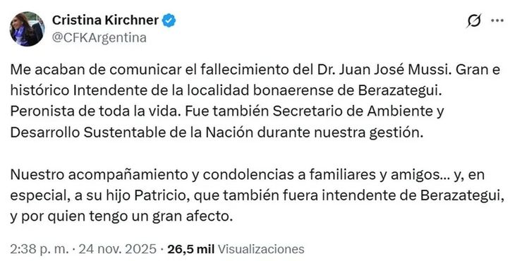 Una de las primeras voces del peronismo que envió condolencias a la familia del intendente fue la titular del PJ. "Me acaban de comunicar el fallecimiento del Dr. Juan José Mussi. Gran e histórico Intendente de la localidad bonaerense de Berazategui. Peronista de toda la vida. Fue también Secretario de Ambiente y Desarrollo Sustentable de la Nación durante nuestra gestión”, escribió Cristina en sus redes sociales.