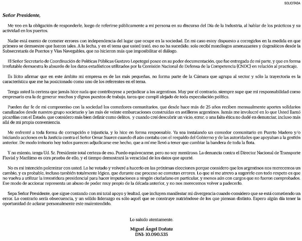 Me veo en la obligación de responderle, luego de referirse públicamente a mi persona en su discurso del Día de la Industria, al hablar de los prácticos y su actividad en los puertos.