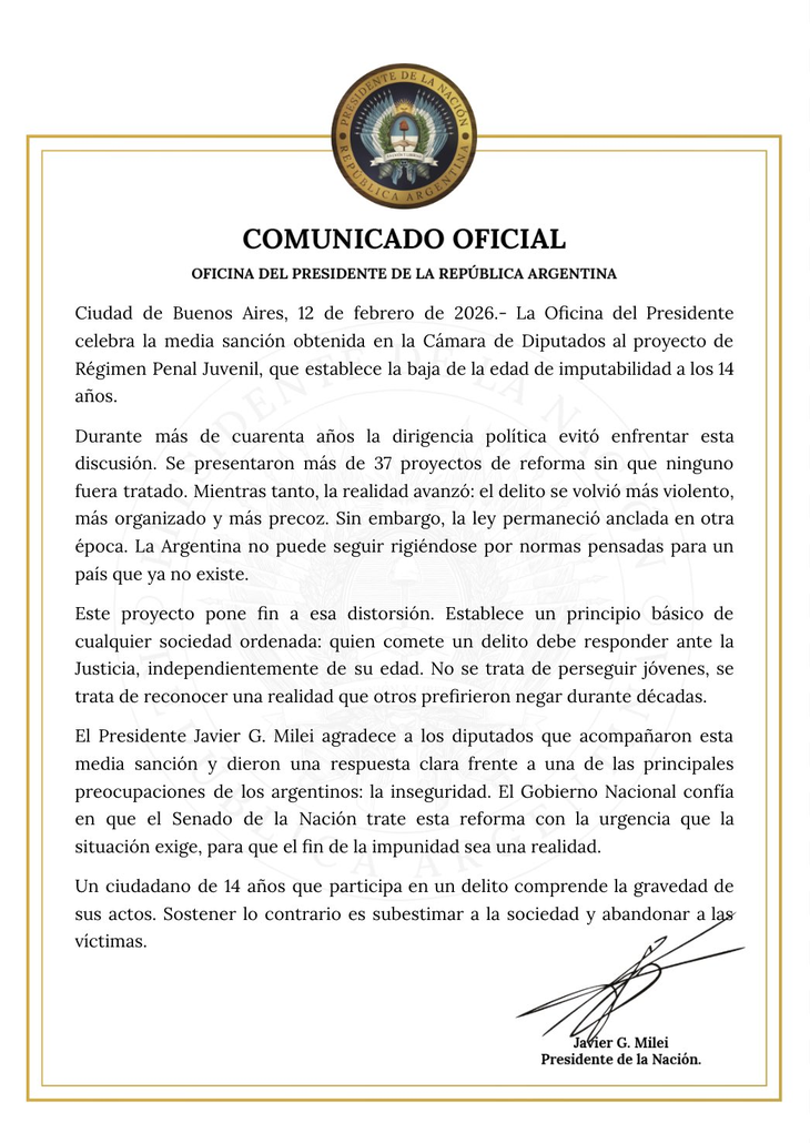 “El Presidente Javier G. Milei agradece a los diputados que acompañaron esta media sanción y dieron una respuesta clara frente a una de las principales preocupaciones de los argentinos: la inseguridad”, expresa el escrito.
