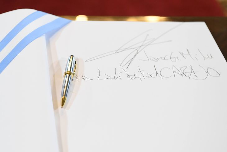 Luego de estampar su firma y aclaración, el mandatario escribió en letra de imprenta la frase que ya forma parte de su lema: "Viva la libertad, Carajo".