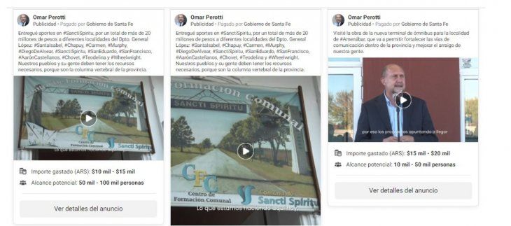 Por su parte, el Gobierno de la Provincia de Santa Fe pagó publicidades del perfil oficial del gobernador Omar Perotti (Frente Juntos) por casi $ 700 mil. En los posteos se presentan acciones de gestión, pero centradas principalmente en apariciones del mandatario. Lo mismo ocurrió con el intendente de Tigre, Julio Zamora (Frente de Todos), quien publicó avisos de gestión en su cuenta personal por $ 340 mil, solventados en este caso por la Municipalidad.