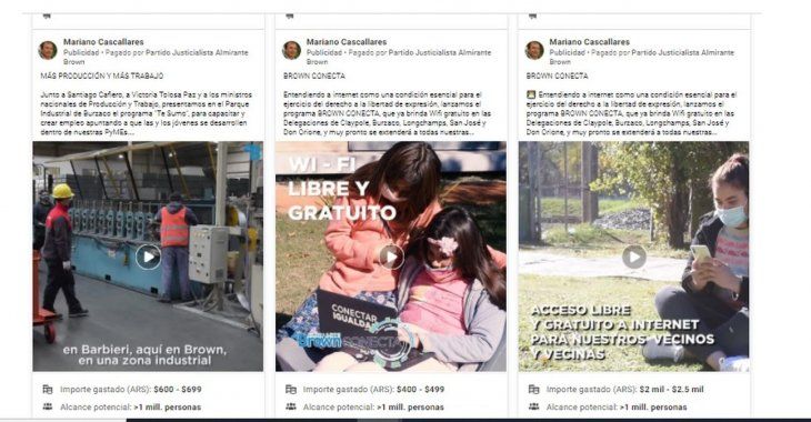 También aparecen en el listado de publicidades posteos de cuentas oficiales de funcionarios, pagados por sus partidos. Es el caso de los intendentes oficialistas de Esteban Echeverría, Fernando Gray, y de Almirante Brown, Mariano Cascallares, quienes publicaron avisos de gestión financiados por el Partido Justicialista de sus distritos.