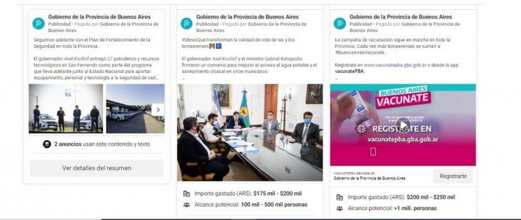 En cuarto lugar aparece la Provincia de Buenos Aires, con gastos por casi $ 4,5 millones en los que se publicitan obras públicas, gestiones en seguridad y el plan de vacunación. El Gobierno de la Ciudad de Buenos Aires, por su parte, pautó posteos por más de $ 2,2 millones en los últimos 90 días, también relacionados con la gestión.