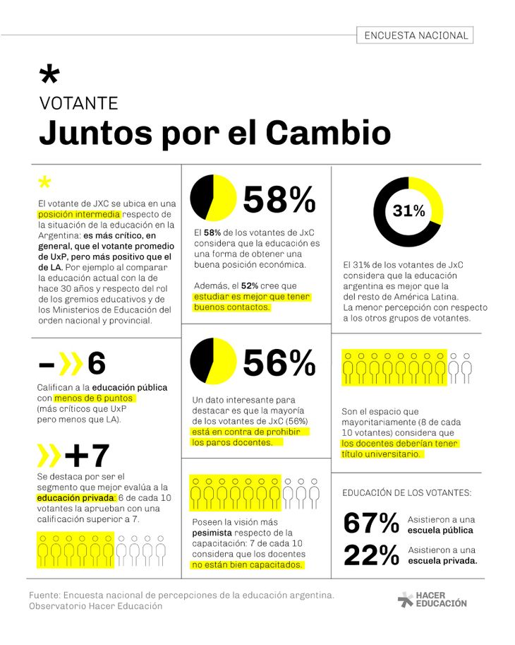 En contraposición, en Juntos por el Cambio predomina el pesimismo: siete de cada diez consideran que los docentes no están bien capacitados y ocho de cada diez sostienen que los docentes deberían tener título universitario.