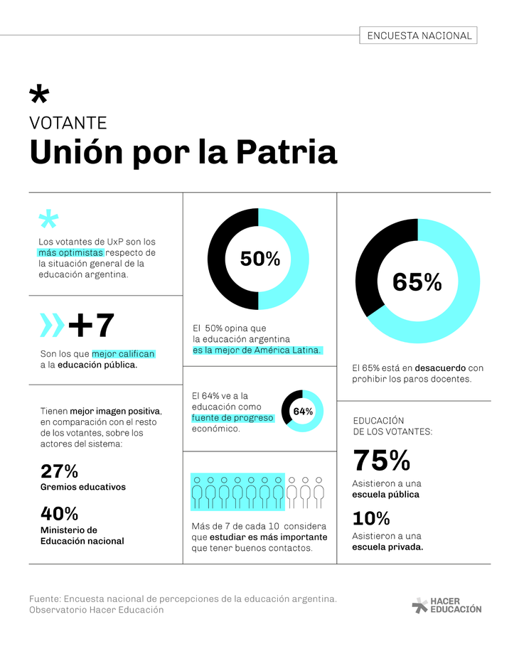 Los votantes del oficialismo en estas elecciones cuentan con una particularidad: son los electores más optimistas de cara al futuro. "Defensores de la educación pública, consideran a la educación como sinónimo de movilidad social. Los que mejor califican a la educación pública y sostienen que es la mejor en América Latina", explica el Observatorio.