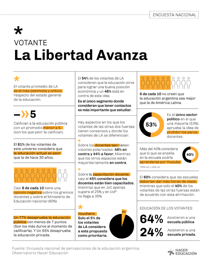 A su vez, los electores libertarios piensan que más de la mitad de los docentes no cuentan con una buena capacitación: "Son los que más duramente califican a la educación: con 5 y menos, y el 81% de los encuestados consideran que la educación está peor que treinta años atrás; tienen una marcada opinión negativa hacia los gremios y creen que el 45% de los docentes están bien capacitados".