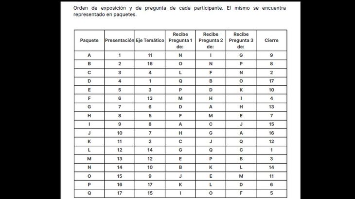 Luego, cada candidato recibirá tres preguntas consecutivas de distintos contrincantes. A partir de ese momento, contará con hasta dos minutos para elaborar todas las respuestas, en bloque.