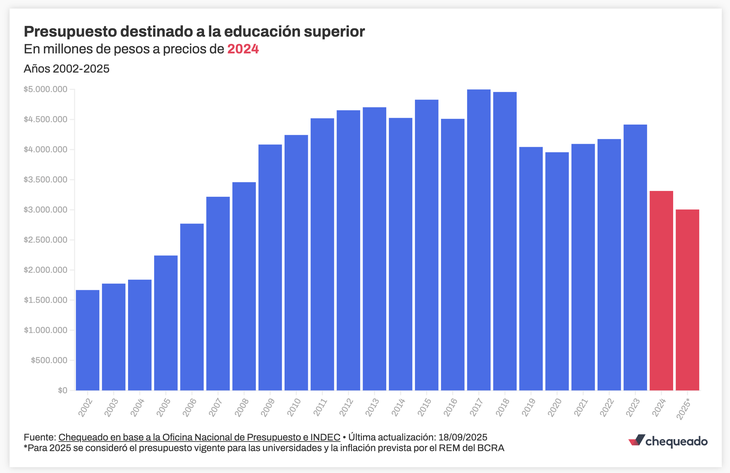 Dentro del período analizado (2002-2025), los años de mayor inversión en educación superior fueron 2015, 2017 y 2018, cuando se destinó el equivalente a casi $ 5 billones actuales.