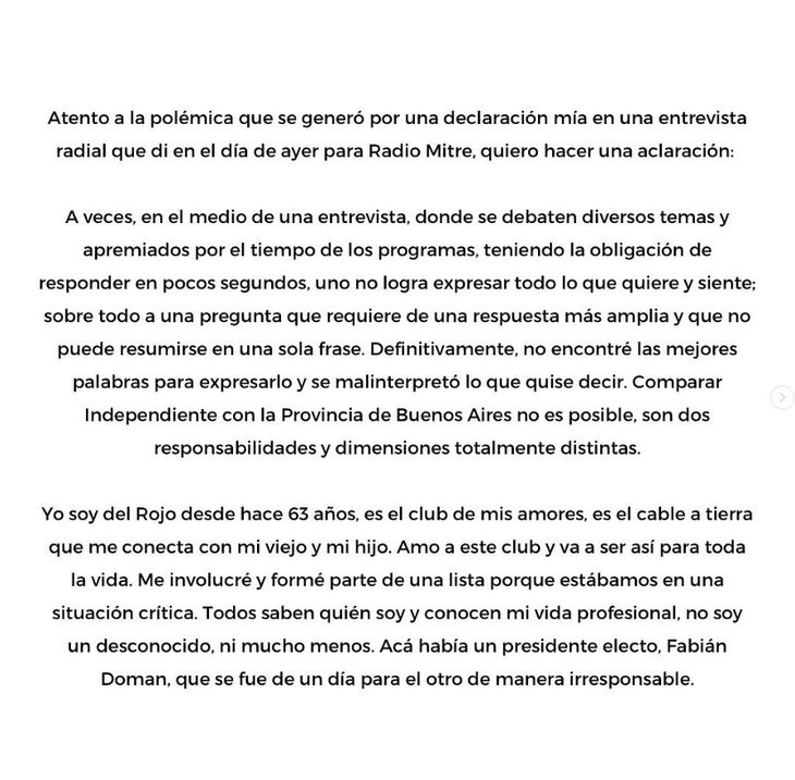 "Definitivamente, no encontré las mejores palabras para expresarlo y se malinterpretó lo que quise decir. Comparar Independiente con la Provincia de Buenos Aires no es posible, son dos responsabilidad y dimensiones totalmente distintas”, agregó en el texto.