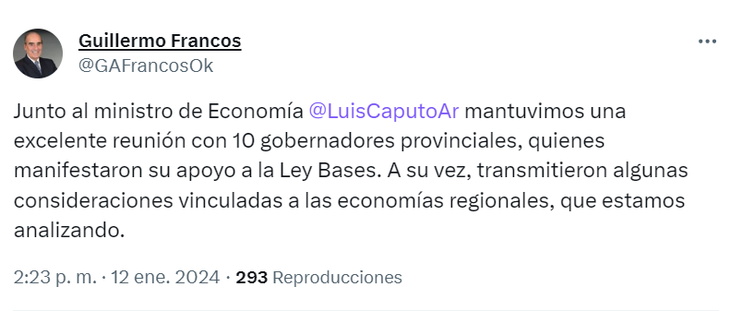Francos calificó la reunión de "excelente" en un mensaje que publicó en la red social X y sostuvo que los mandatarios provinciales "manifestaron su apoyo a la Ley Bases", aunque con consideraciones en relación a las economías regionales tan importantes para las provincias.
