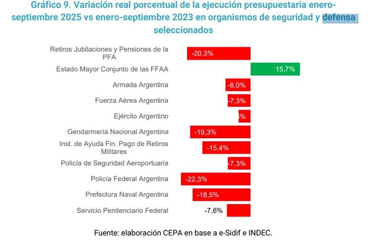 IOSFA es la tercera obra social más grande del país, con alrededor de 600.000 afiliados. En el último año y medio viene atravesando inestabilidades en su gestión, con endeudamiento y cambios de directivos: actualmente la preside Bettina Surballe, que antes de ese rol estuvo al frente de otra caja del Ministerio de Defensa, el Instituto de Ayuda Financiera para el Pago de Retiros Militares (IAF). Según el CEPA, para septiembre de este año la caída interanual de la ejecución de ese organismo fue del 15%, en sintonía con la reducción de financiamiento del ministerio (-3,5%), de la Armada Argentina (-8%), el Ejército Argentino (-4%), la Fuerza Aérea Argentina (-7%) y la Caja de Retiros de la Policía Federal (-20%).