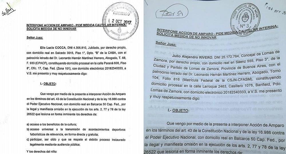 "Solicito se suspenda la entrada en vigencia del Sistema de Fútbol Codificado hasta tanto se resuelva el presente amparo y se cumpla con la audiencia pública y programación establecida en los articulos 77, 78 y 80 de la Ley 26.522", afirman los textos en sintonía. Los damnificados exigente que se suspenda la derogación del programa Fútbol para Todos (FPT), vigente desde el 21 de agosto de 2009.
