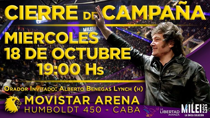 El candidato presidencial de La Libertad Avanza (LLA), Javier Milei, confirmó que el 18 de octubre cerrará su campaña de cara a las elecciones del 22 del mismo mes en el Movistar Arena en la Ciudad de Buenos Aires al igual que lo hizo en la previa de las Primarias Abiertas Simultáneas y Obligatorias (PASO).