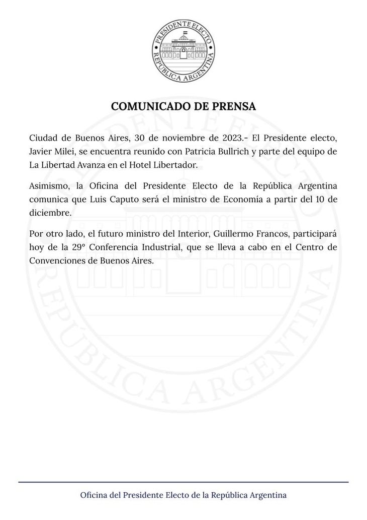El presidente electo, Javier Milei, comunicó de manera oficial su decisión de nombrar como ministro de Economía al exfuncionario macrista, Luis "Toto" Caputo.