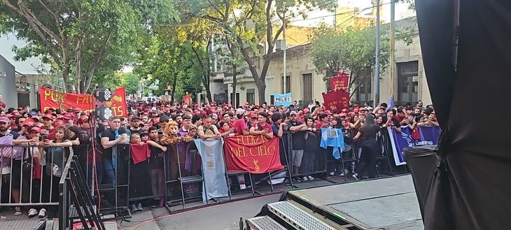 Antes de la llegada de Milei al canal de streaming, cientos de seguidores se concentraron en la puerta del lugar para manifestar su apoyo al Presidente. La gran mayoría de ellos con remeras o banderas de "Las Fuerzas del Cielo", la agrupación libertaria que tiene a Daniel Parisini, el "Gordo Dan" como máximo referente.