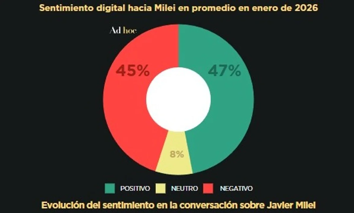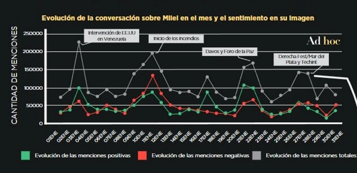 Según un informe de la consultora Ad Hoc, el sentimiento digital positivo se explicó, principalmente, por las menciones vinculadas a las celebraciones del secuestro de Nicolás Maduro en Venezuela, llevado adelante por el gobierno de Donald Trump, y por el vínculo de Milei con Estados Unidos.