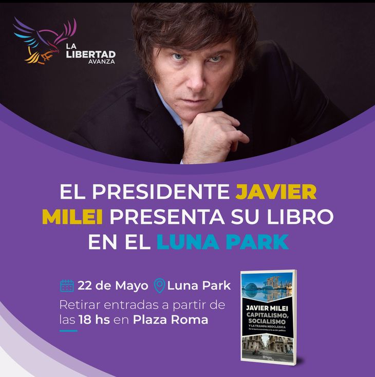 A través de su cuenta de la red social X (ex Twitter) el presidente Javier Milei anunció el evento y confirmó dónde y cómo retirar las entradas gratis para la presentación de su último libro “Capitalismo, socialismo y la trampa neoclásica”.