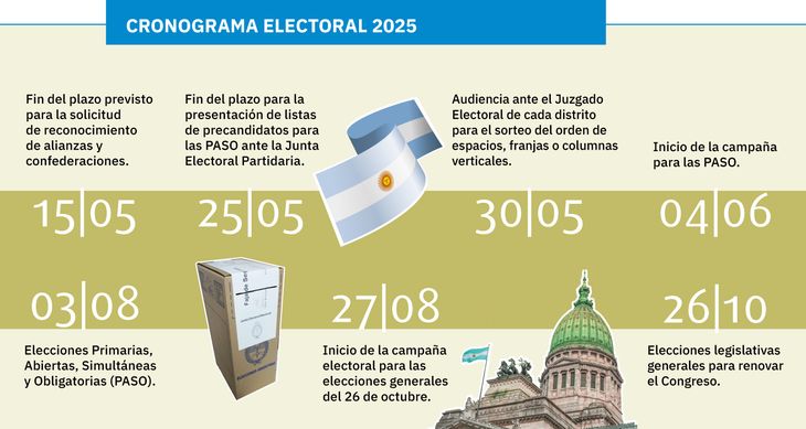 De acuerdo al cronograma de la Cámara Nacional Electoral, siempre y cuando no se eliminan por ley, las PASO se celebrarán el domingo 3 de agosto, mientras que las elecciones generales, en los que los ciudadanos elegirán 24 senadores y 127 diputados nacionales, se realizarán el 26 de octubre. Sin embargo, la primera fecha crítica del calendario electoral será el 15 de mayo cuando se deberá pedir el reconocimiento de alianzas. Esa es la fecha límite para que limen asperezas Milei y Macri pero también los distintos sectores en pugna del peronismo. El 25 de mayo concluye el plazo para la presentación de listas de precandidatos para las PASO ante la Junta Electoral Partidaria.