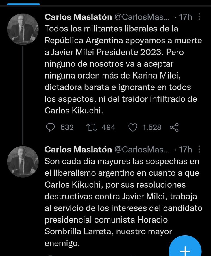 En ese hilo de mensajes, Maslatón no cesó y continuó con las críticas al entorno de Javier Milei: “Mayoritariamente jóvenes entusiastas, que militan por la causa, dispuestos a todo para ganar en 2023, que no piden ni cargos ni plata, que solo aguardan instrucciones, han sido olvidados como unidades de ejército desbandado en camino de la derrota final”, expresó.