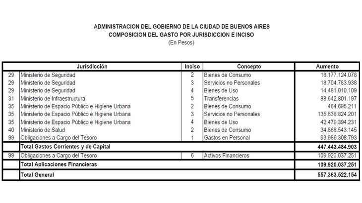 También contempla el incremento de las transferencias por un monto de $88.642.801.197. "Estas mayores erogaciones corresponden, en su totalidad, a las transferencias de capital hacia la empresa Subterráneos de Buenos Aires Sociedad del Estado (SBASE)", aclara el texto.