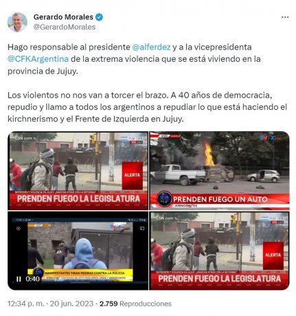 Justamente, el mandamás de Jujuy y precandidato a presidente fue quien lanzó la primera piedra. "Hago responsable al presidente Alberto Fernández y a la vicepresidenta Cristina Kirchner de la extrema violencia que se está viviendo en la provincia de Jujuy. Los violentos no nos van a torcer el brazo", escribió Morales en su cuenta oficial de Twitter, a pocos minutos de haber concretado la jura de la reforma de la Constitución provincial.