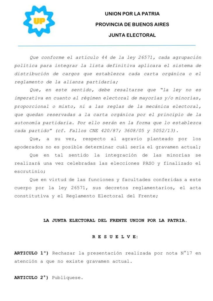 Con respecto a la "integración de las minorías", uno de los principales reclamos del sector que encabeza Daniel Scioli, la Junta Electoral de Unión por la Patria consideró que este proceso "se realizará una vez celebradas las elecciones PASO y finalizado el escrutino" y analizó que no existe ningún tipo de agravio.