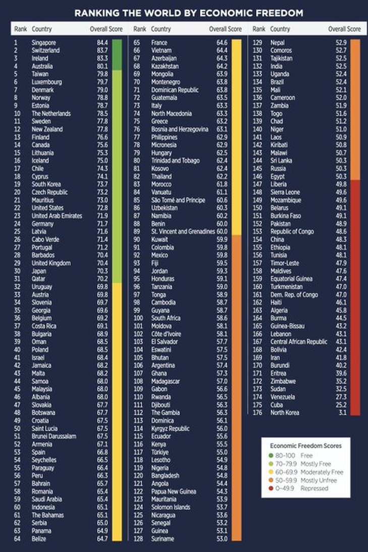 El nuevo listado ubica en lo más alto del ranking a Singapur, con un puntaje de 84.4 sobre 100. El país asiático es seguido por Suiza (2°), Irlanda (3°) y Australia (4°), países que conforman el grupo denominado como totalmente económicamente libres.
