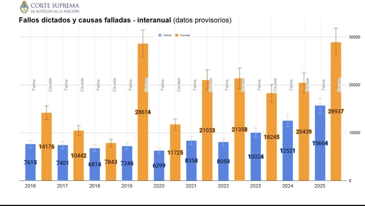 La Corte Suprema de Justicia de la Nación cerró el año con un récord histórico de sentencias. En 2025 dictó casi 15.700 y resolvió cerca de 28.900 causas.