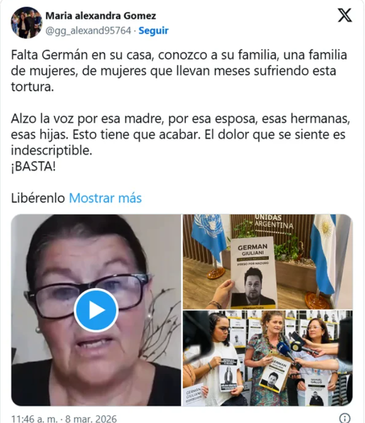 María Alexandra Gómez, pareja del gendarme argentino Nahuel Gallo, reclamó públicamente la liberación de Germán Giuliani, otro ciudadano argentino que continúa detenido en Venezuela, y visibilizó el drama que atraviesa su familia.