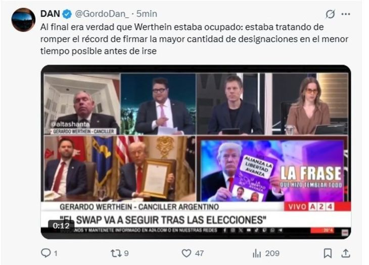 En contraste, sectores libertarios celebraron la salida. El influencer oficialista Daniel Parisini (“Gordo Dan”), cercano a Santiago Caputo, se atribuyó irónicamente haber impulsado su salida y recordó críticas previas al canciller por no advertir al Gobierno de EE.UU. sobre el carácter no presidencial de la elección del 26 de octubre.