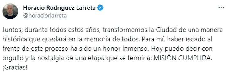 El alcalde, que llegó a la Jefatura porteña en 2015, calificó como "un honor inmenso" haber estado "al frente de este proceso". "Hoy puedo decir con orgullo y la nostalgia de una etapa que se termina: misión cumplida. ¡Gracias!", agregó.