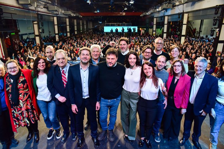 En el escenario, lo escoltaban representantes de todos los sectores de Unión por la Patria: desde su compañero de fórmula Matías Lammens hasta el diputado Itaí Hagman, allegado a Juan Grabois, pasando por los cercanos a Cristina Kirchner como Graciana Peñafort y Eduardo Valdés.