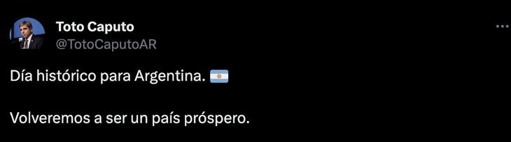 El ministro de economía, luego de anunciar la semana pasada la quita del capítulo fiscal, con el fin de lograr los votos necesarios para la aprobación que finalmente ocurrió, se expresó escribiendo: ''Día histórico para Argentina. Volveremos a ser un país próspero''.