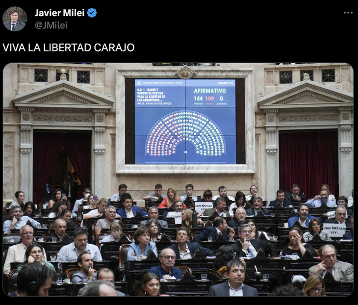 El Presidente e impulsor del proyecto de ley ómnibus, posteó: ''Viva la libertad carajo'', tras la obtención de 144 votos a favor de la ley, contra 109 negativos de la oposición. Los votos positivos, además de La Libertad Avanza y el PRO, provinieron de integrantes del radicalismo, Hacemos Coalición Federal, Innovación Federal y el nuevo Bloque Independencia.