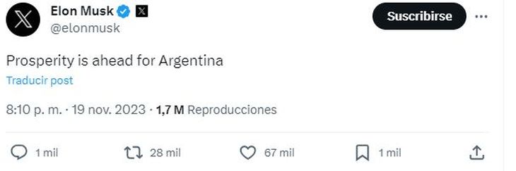 "La prosperidad está por delante para Argentina" es lo que escribió el magnate estadounidense. Y lo hizo respondiendo a una publicación que hizo otro usuario que también celebró el triunfo del libertario.
