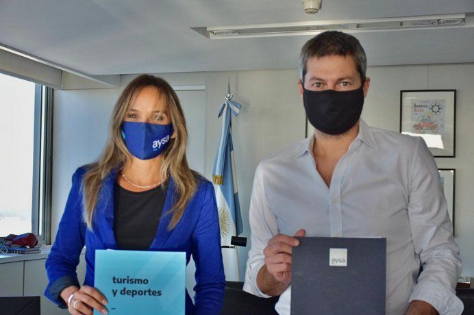 La titular de AySA, Malena Galmarini y el ministro de Deportes y Turismo, Matías Lammens, durante la firma del convenio.
