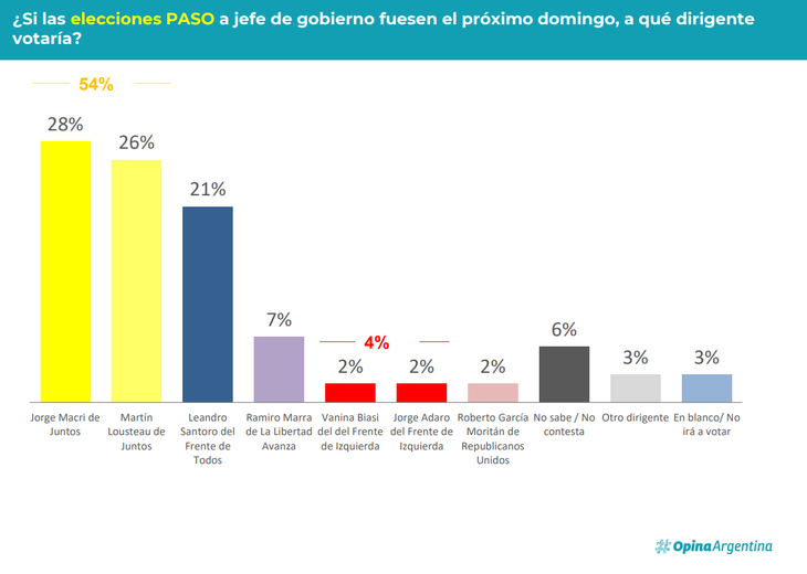 El estudio también revela un amplio triunfo de Juntos por el Cambio en la ciudad de Buenos Aires: obtendría 54% de los votos, donde por el momento se impondría Jorge Macri con el 28% de los votos, frente a Lousteau, con el 26%. Los escoltaría Leandro Santoro (Unión por la Patria) con el 21%; Ramiro Marra (La Libertad Avanza) con 7%; el Frente de Izquierda-Unidad (la muestra registró empate técnico entre los precandidatos Vanina Biasi y Jorge Adaro) con el 4%; y Roberto García Moritán (Republicanos Unidos) con el 2%.