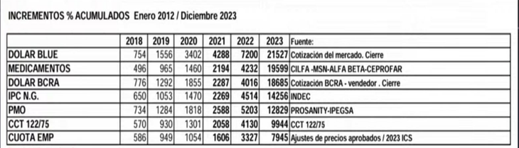 Sin embargo, desde la medicina prepaga se señala que las compañías, con estos aumentos, intentaron recuperar – parcialmente- el retraso sufrido en los precios en los últimos años. Los datos del sector arrojan que entre enero de 2012 y diciembre de 2023 los medicamentos subieron 19.599%, el índice de precios al consumidor 14.256% y la cuota de la medicina prepaga 7.945%.