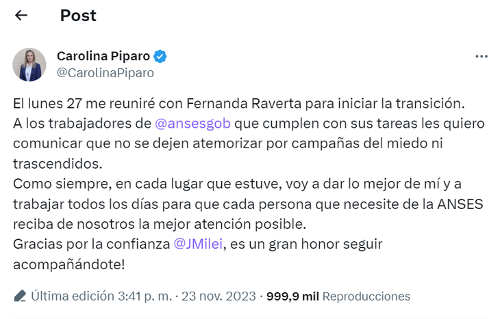 Milei había confirmado a Píparo al frente de ANSES a principios de la semana, pero este jueves por la tarde se conoció la decisión de apartarla de ese lugar para colocar allí a Osvaldo Giordano, un hombre muy cercado al gobernador de Córdoba, Juan Schiaretti.