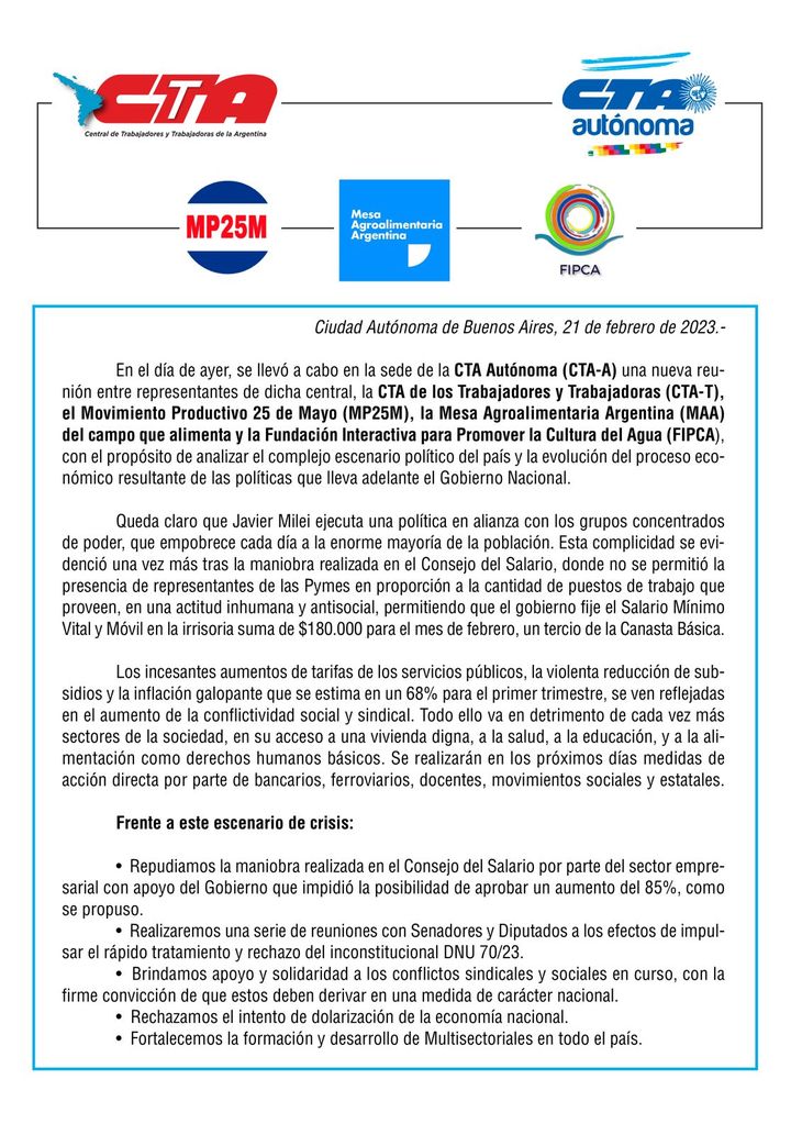 A través de un comunicado, una serie de organismos sociales y sindicatos reunidos en la sede de la CTA Autónoma se expresaron luego del decreto que estableció el salario mínimo considerando que "Javier Milei ejecuta una política en alianza con los grupos concentrados de poder, que empobrece cada día a la enorme mayoría de la población".