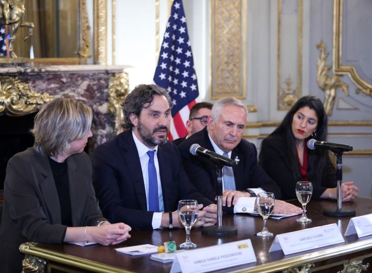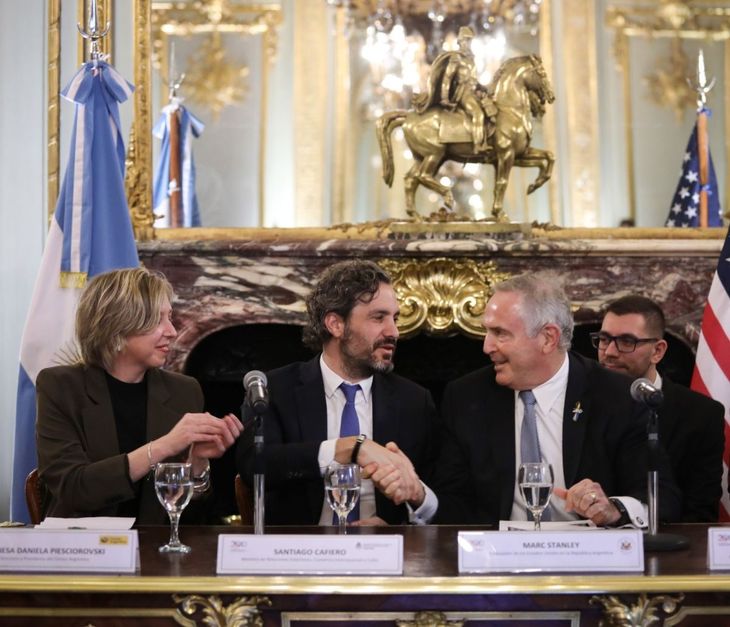 El canciller Santiago Cafiero encabezó este miércoles en el Palacio San Martín el lanzamiento del sello postal que conmemora los 200 años de relaciones diplomáticas entre la Argentina y Estados Unidos, en un acto donde estuvo acompañado por el embajador Marc Stanley y la titular del Correo Argentino, Vanesa Piesciorovski.