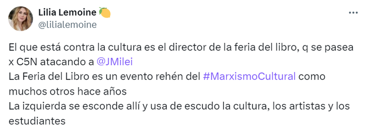 "La Feria del Libro es un evento rehén del Marxismo Cultural como muchos otros hace años. La izquierda se esconde allí y usa de escudo la cultura, los artistas y los estudiantes", indicó en un posteo en la red social X.