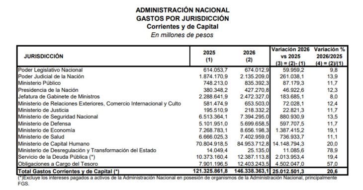 El Presupuesto 2026 estipula para el Ministerio de Seguridad de más de $7,394 billones (aunque la ministra habló de $7,8 billones). Aunque en sus dos años de gestión Bullrich contó con financiamiento prorrogado por la falta de aprobación de leyes presupuestarias y la irregularidad de las partidas, una dimensión de la prioridad que tiene esa cartera para la administración nacional es que contaría con mayores fondos que los dispuestos para Defensa, Justicia, Cancillería, Desregulación y el Poder Legislativo combinados.