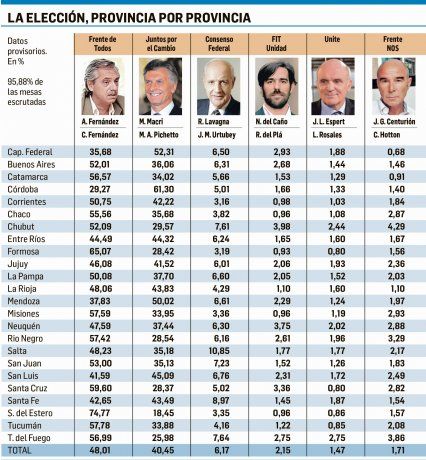 Macri logró revertir el resultado de la PASO en Santa Fe, Entre Ríos, San Luis y Mendoza, donde había perdido en las primarias pero ayer salió triunfante en esas provincias. En Córdoba, principal plaza electoral del antikirchnerismo, el Presidente saliente estiró la diferencia a su favor pero no le alcanzó para compensar la paliza que el peronsimo le propinó a Juntos por el Cambio en la provincia de Buenos Aires.