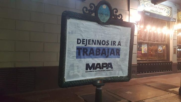 De este modo, la Ciudad amaneció empapelada con estos carteles, con la firma del “Movimiento Antipiquetero Argentino” (MAPA), encabezado por el legislador porteño Ramiro Marra de Libertad Avanza, el espacio político de Javier Milei.