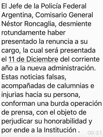 "El jefe de la PFA, comisario General Néstor Roncaglia, desmiente rotundamente haber presentado la renuncia a su cargo, la cual eventualmente será ofrecida el 11 de diciembre", indicaron desde la misma fuerza en un comunicado.