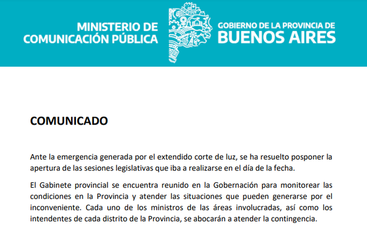 Por los cortes de luz en gran parte de la provincia de Buenos Aires -especialmente en los distritos del Gran Buenos Aires- Axel Kicillof conformó una mesa técnica de emergencia en la que se analizó los alcances del problema y se decidió suspender el evento programado para este miércoles.