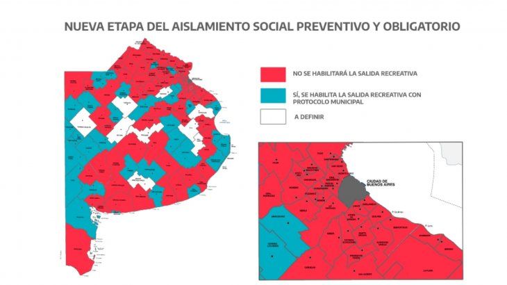 En tanto que Baradero, Exaltación de la Cruz, Punta Indio, Brandsen, General Paz, Lobos, Las Flores, Rauch, Azul, General Lavalle, Tordillo, General Madariaga, General Alvarado, Benito Juárez, Laprida, Coronel Suárez, Tornquist, Villarino, Monte Hermoso y Puán sí permitirá la salida recreativa.
