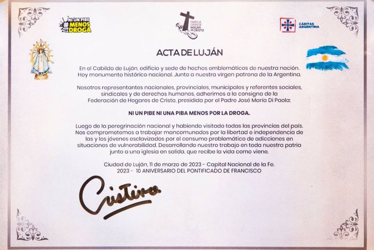 Hogares de Cristo completará la firma del acta compromiso con otros dirigentes políticos durante una ceremonia que realizará el próximo sábado a las 11 en el Cabildo de Luján, según detalló la organización.