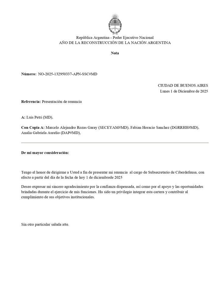 El decreto 795/2025 de designación de Ozán se dio a conocer en el Boletín Oficial del 12 de noviembre y el texto decía que su nombramiento era retroactivo al 15 de setiembre. Pero en rigor el coronel Ozán fungía de asesor en la subsecretaría y recién tomó plena responsabilidad y ejercicio de funciones como subsecretario de Ciberdefensa en la fecha de publicación del Boletín.